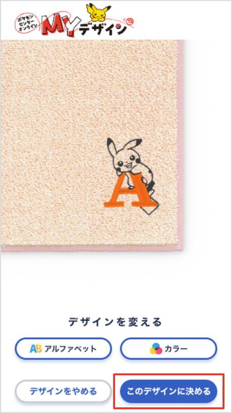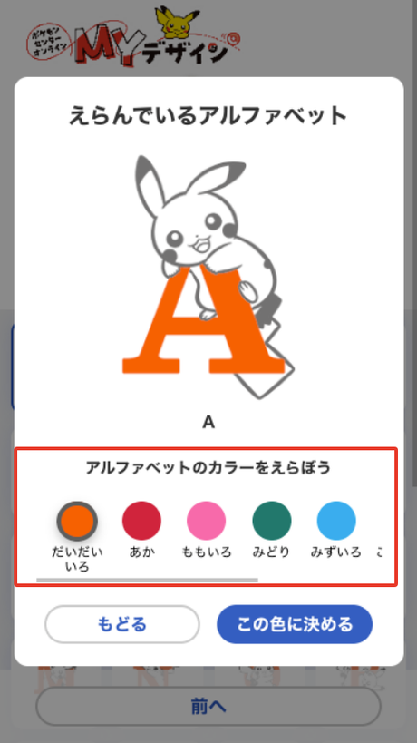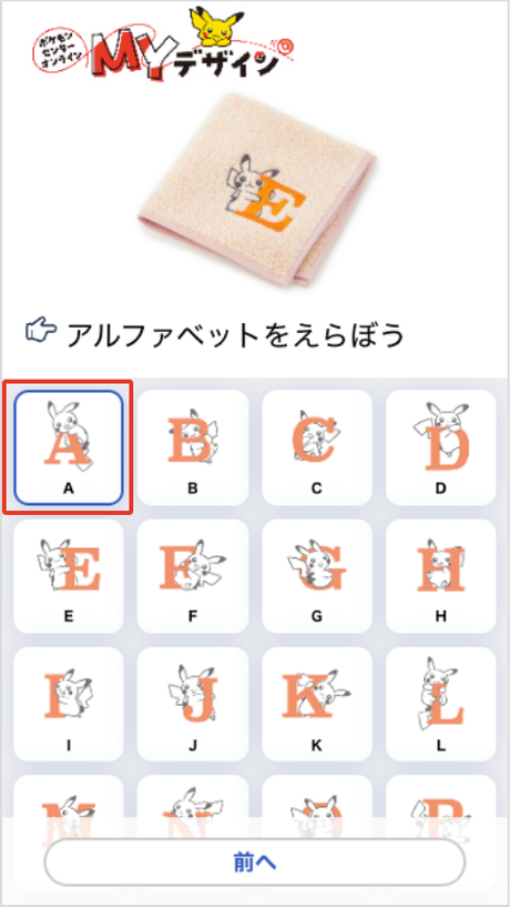 ピカチュウとアルファベットを変えたい場合は、「アルファベット」ボタンを押して変更画面へ進む